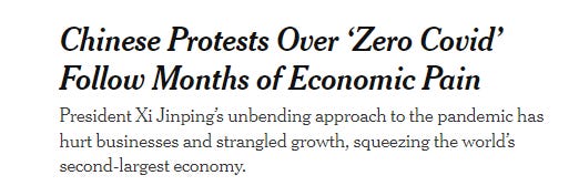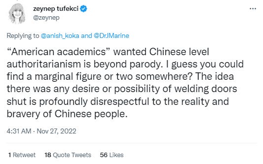 These headlines are, of course, in addition to the hundreds of other commentators, influencers, and health officials, such as NYT journalist Zeynep Tufekci, who used their platforms in 2020 to urge for lockdowns that were even stricter than those their governments imposed, but now join in support for those in China protesting the same policies they were urging their own countries to emulate.