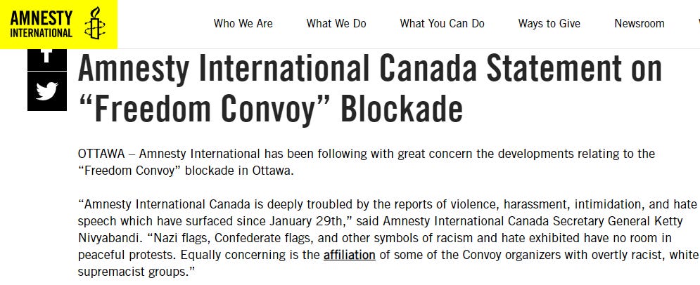 Earlier this year, Amnesty International issued a statement of concern about Canada’s anti-lockdown Freedom Convoy protests being affiliated with “overtly racist, white supremacist groups,” even as Justin Trudeau invoked the Emergencies Act to crush the protests.