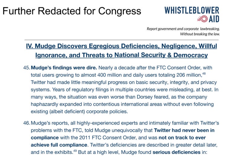 According to the Mudge report, in 2021, Twitter employed just two employees to identify misinformation across all realms of human knowledge. For the many users, like myself, who’ve been banned from Twitter, the Mudge report raises even more questions. Twitter’s bans are notoriously opaque, but in theory they could be coming from a few different sources: 1. algorithms, 2. brigades of antagonistic user reports, 3. action by one of Twitter’s two misinformation employees, 4. bribery or abuse of these systems by hostile regimes, or 5. extralegal collusion with the federal government, which a rapidly growing body of evidence has shown is taking place.